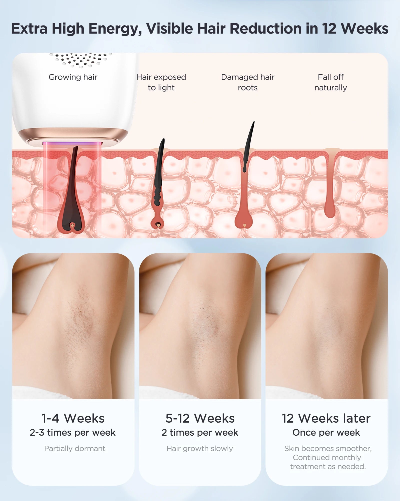 - Benefit from IPL technology delivering up to 97% hair reduction in just 12 weeks by targeting hair follicles with precise 5J/CM² energy and 600nm wavelength, solving the frustration of constant shaving or waxing for a truly lasting solution.